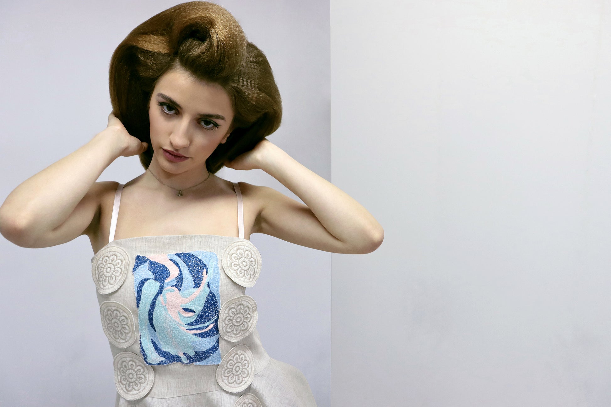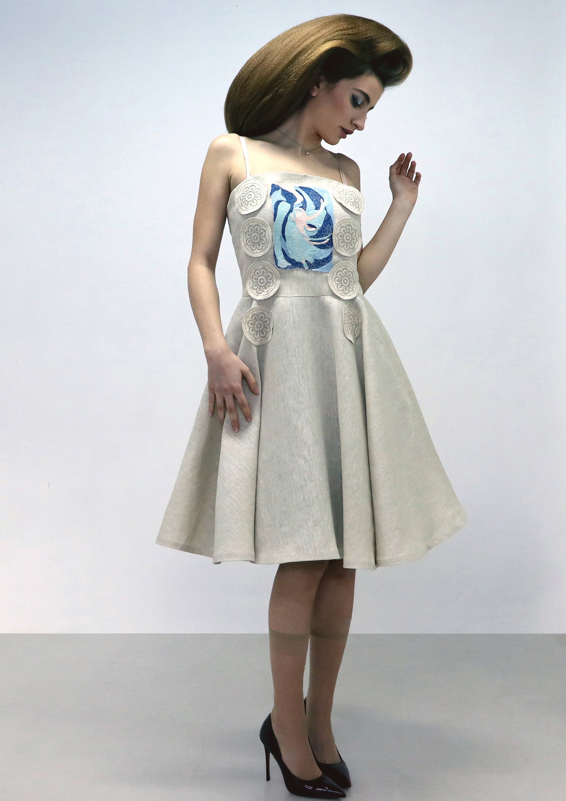 A beautifully romantic linen dress in soft beige, exuding a strong vintage charm—perfect for cultural events and exploring picturesque destinations. Delicate floral motifs and a portrait of a dancing ballet couple add an artistic touch, created through the intricate and time-intensive technique of free-motion embroidery, where the sewing machine becomes a tool for drawing directly onto the fabric. This elegant yet versatile dress pairs easily too with sneakers, sporty shoes, or sandals. Light, airy, and effortlessly chic.