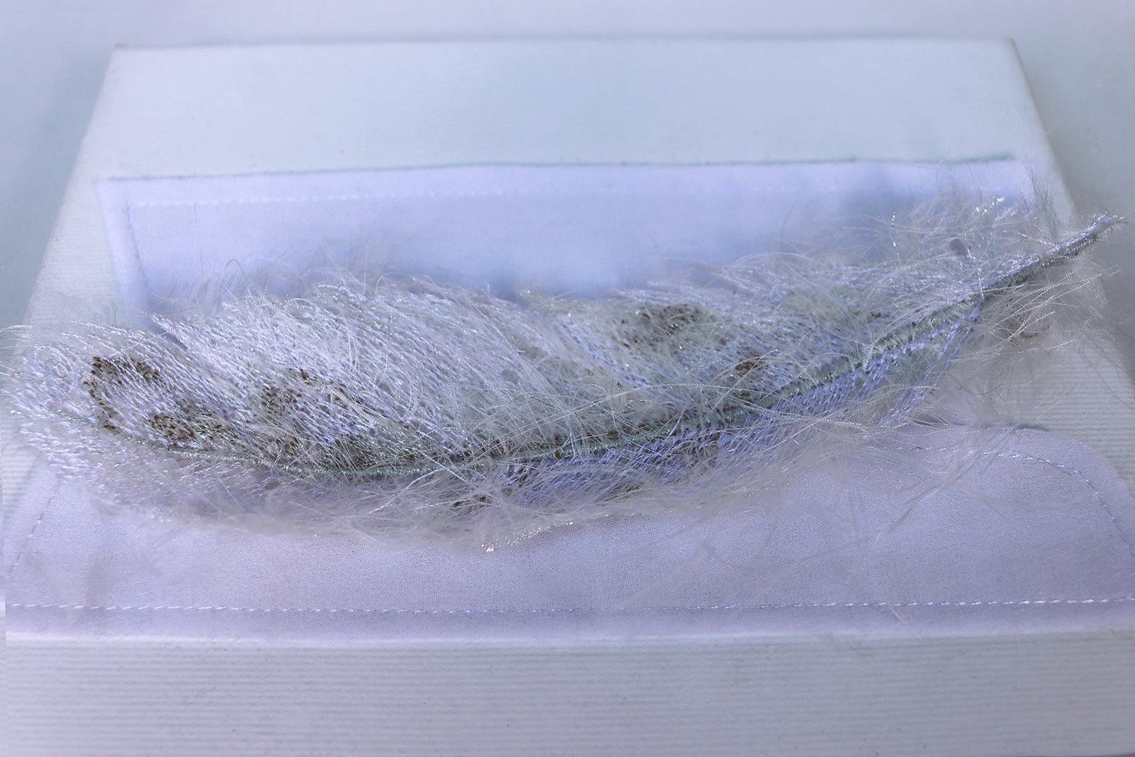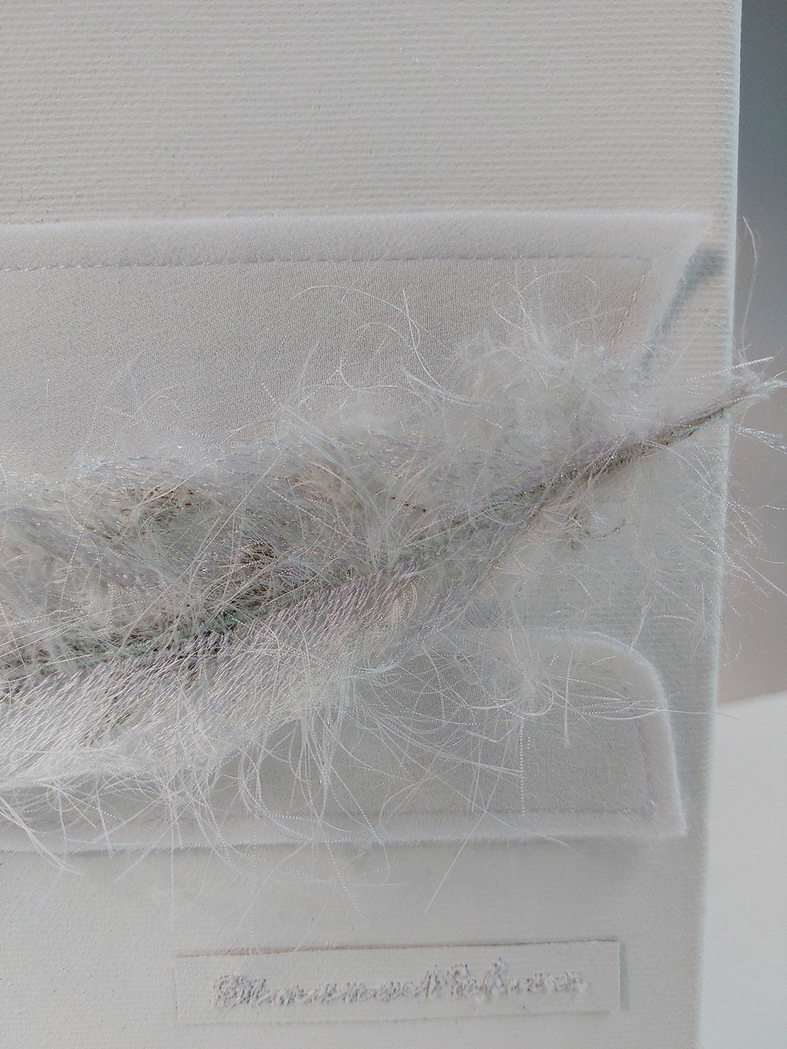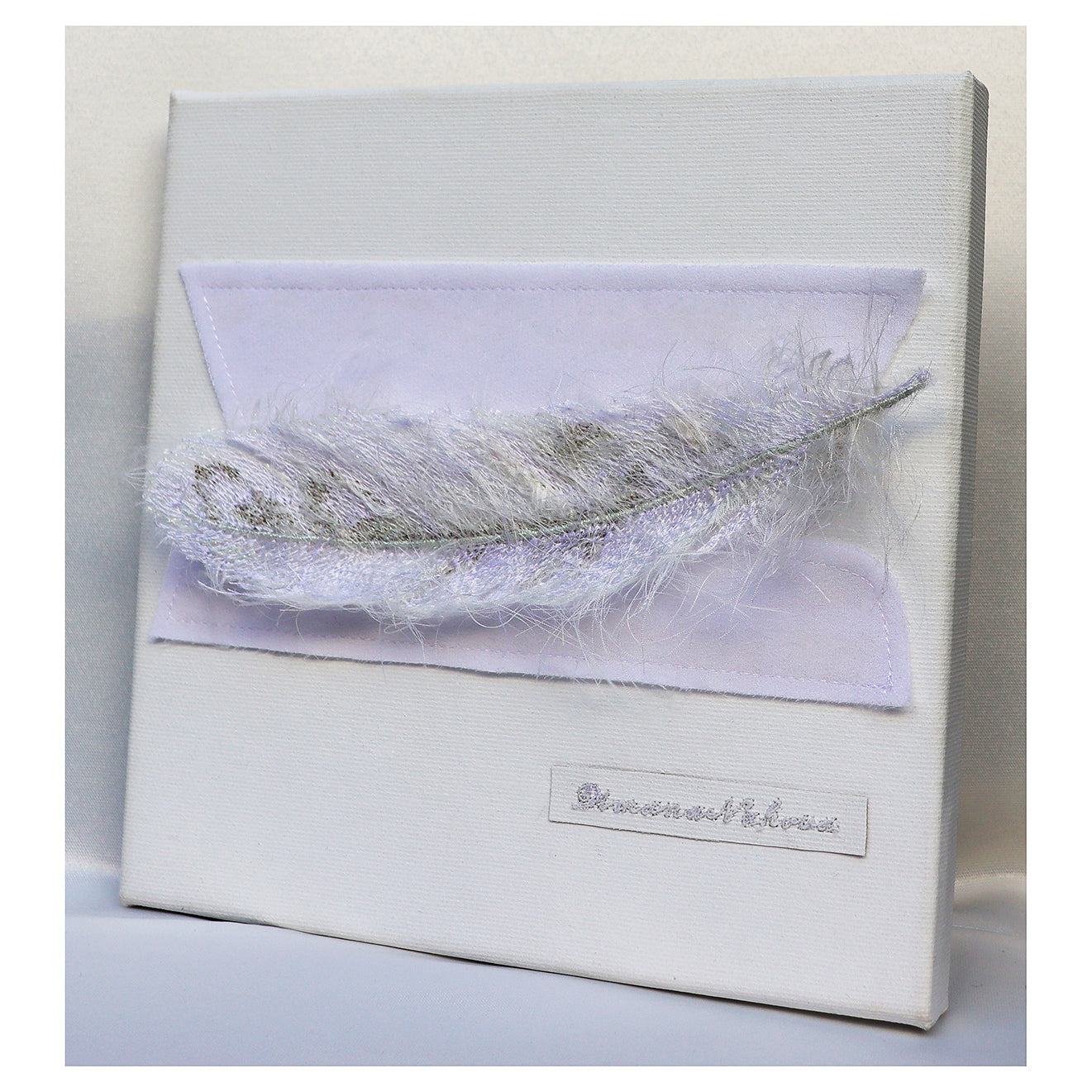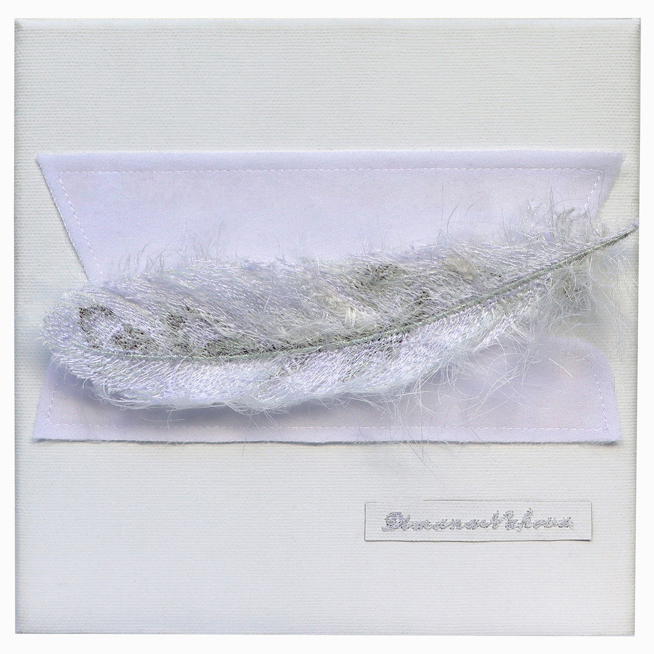- Technique: digitally embroidered feather, further enhanced by using hand made technique of intuitively adding texture, consisted of different kinds of treads; hand stitched to the canvas, two pearls to lift up the feather, in order to make it look 3D