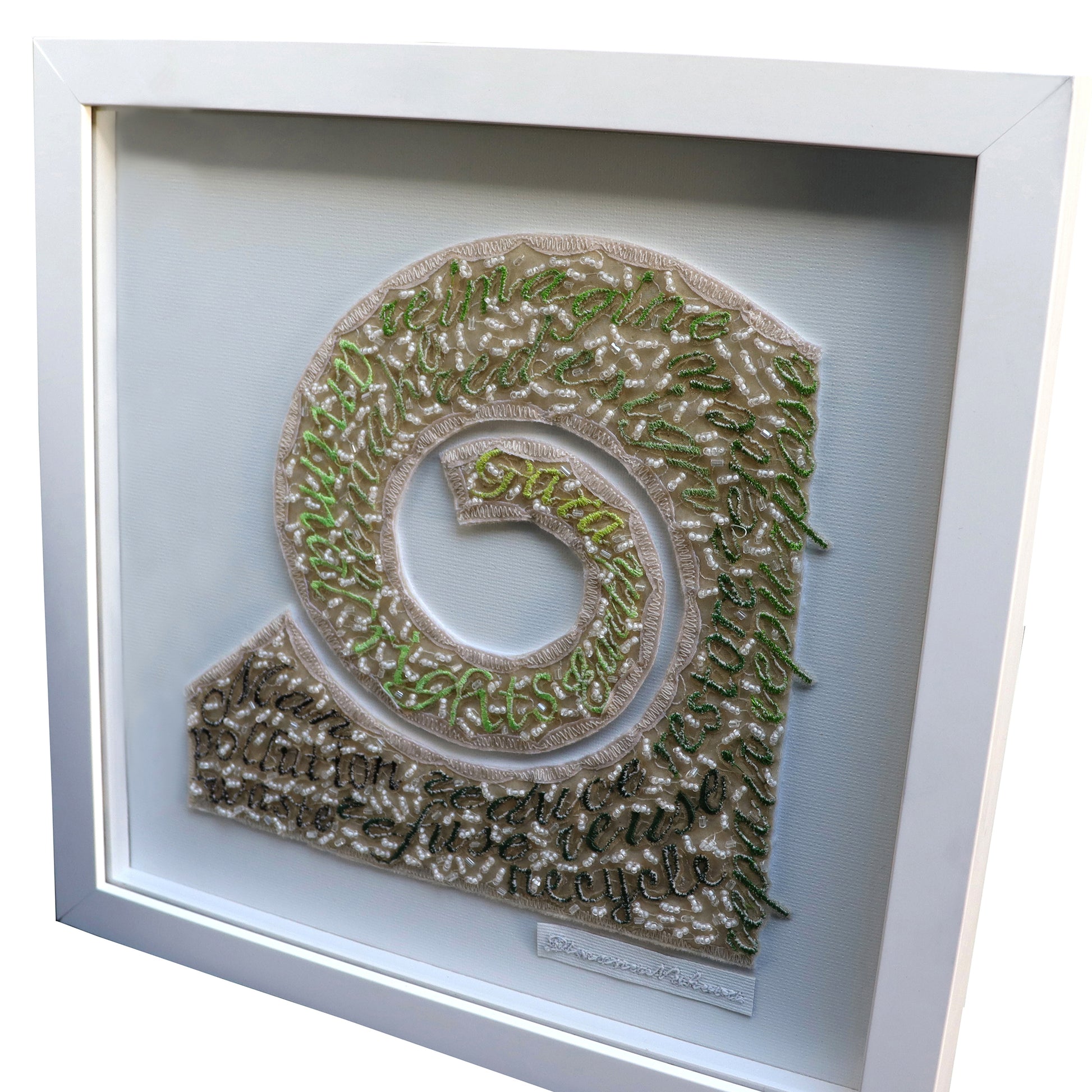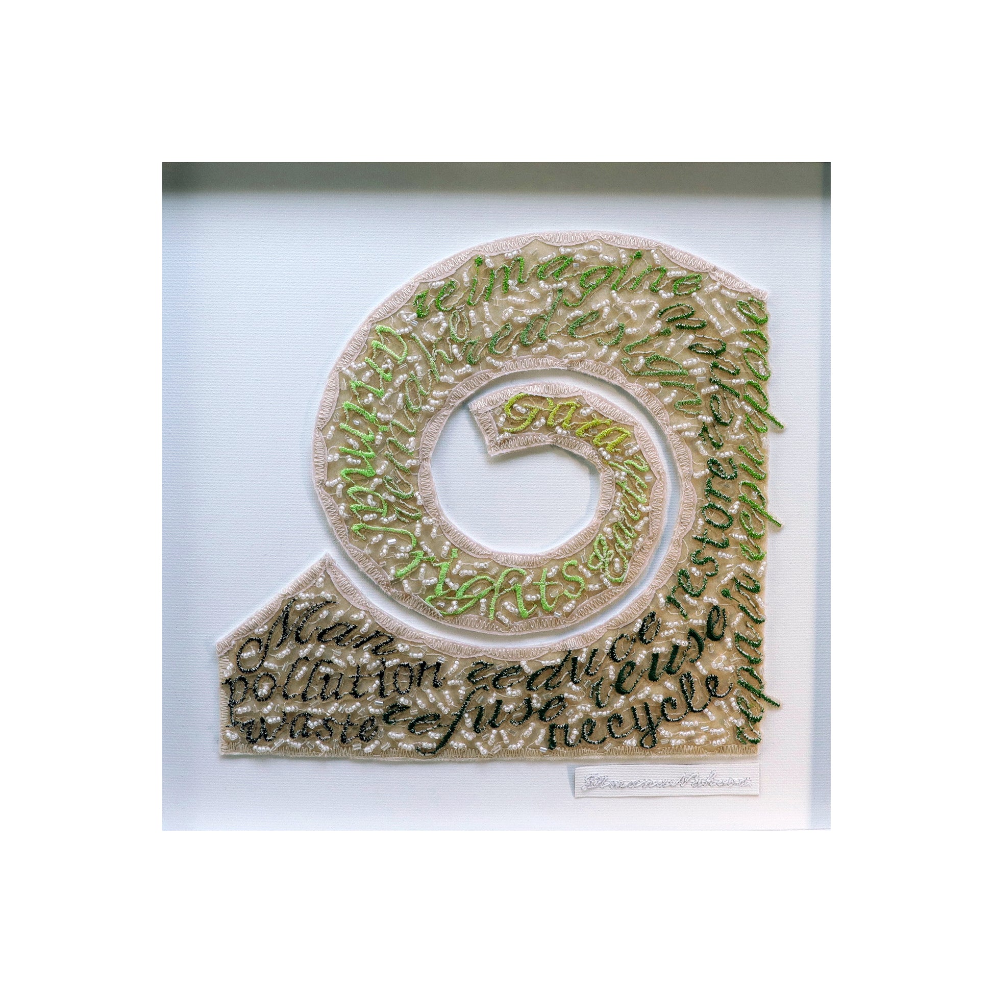 Concept: Spiral, as a main symbol of Evolution, has been chosen to express Man's relationship with Nature. The Evolution of the human spirit takes place from the inside out and requires constant upgrading. The texture of the spiral visualizes the individual's moment of awareness, as well as the process of realizing this interdependence with Nature, its phases and stages that go from denial and rejection to building and perfection. This is accomplished through the use of digitally embroidered words in one work and through the use of embroidered feathers, chosen as a symbol of the animal world in the other. Feathers are also a sign of Angelic presence that helps and encourages the process of ennobling the aura of this planet. Colors are the other means of expression that help to paint the theme. Through their gradation from black to fresh, almost sunny green, we set the direction of the work to be done by us humans. Despite this purposefulness, through the use of bottom ecru thread, none of the colors remain pure, but a mélange. This comes to express the existing dualism of this Earth, namely that while one builds and saves, the other, at the same time, still pollutes and kills. It also shows that we have not reached the phase of "0 WASTE" yet and that even the positive, ecological, already used techniques can still be improved a great deal.The Earth, or Gaia as it is called, is a living being and could only be itself when we take care not to make it sick and use it in ways that would destroy it. She is our home and we are the main factor on which her and our own survival depends!
