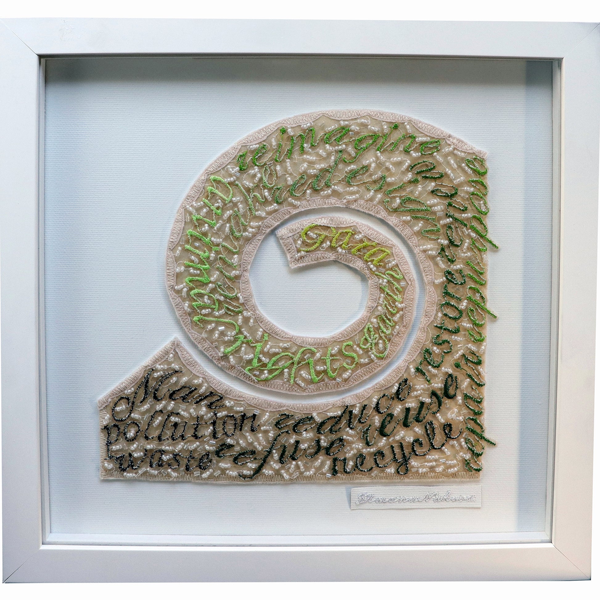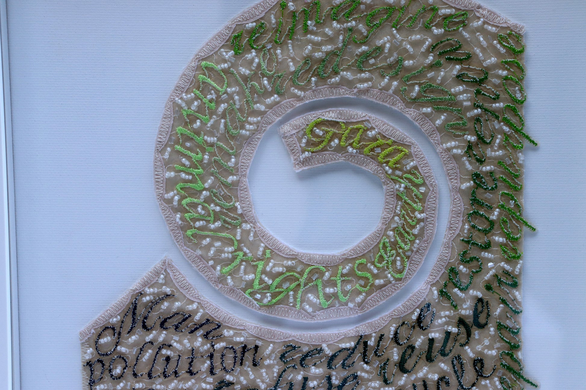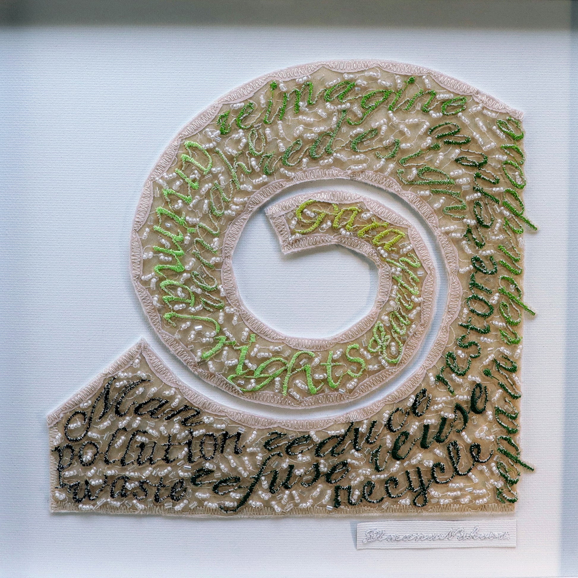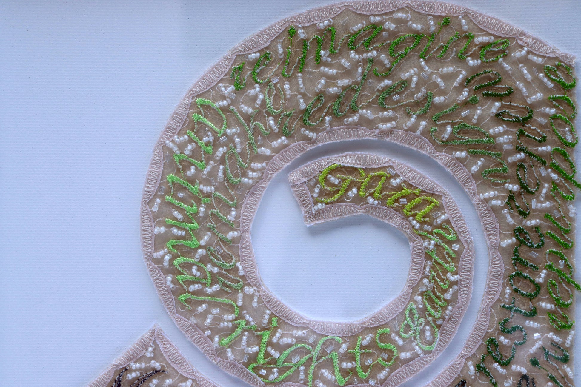 - materials: hand died silk organza, digitally embroidered words, hand beaded and stitched, felt