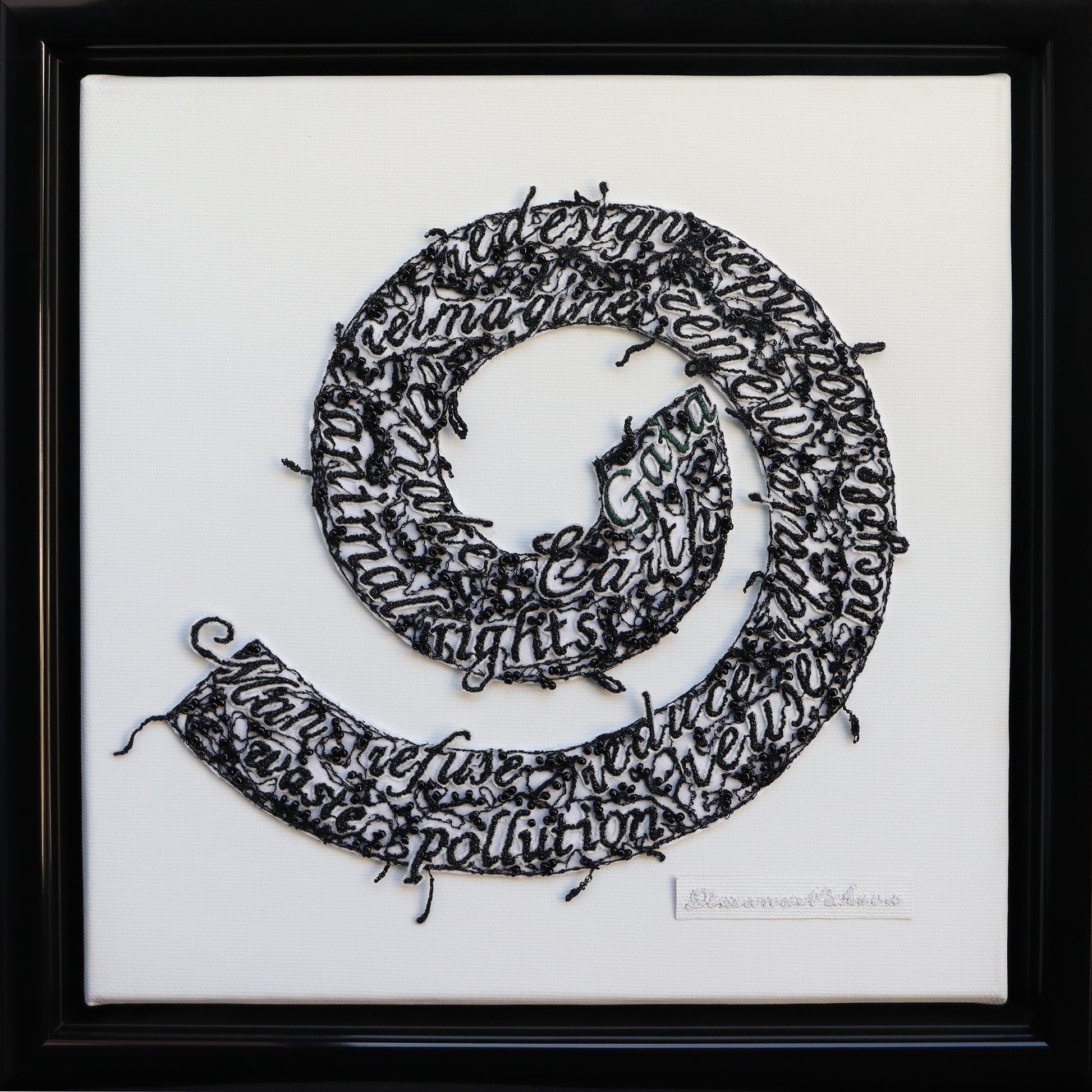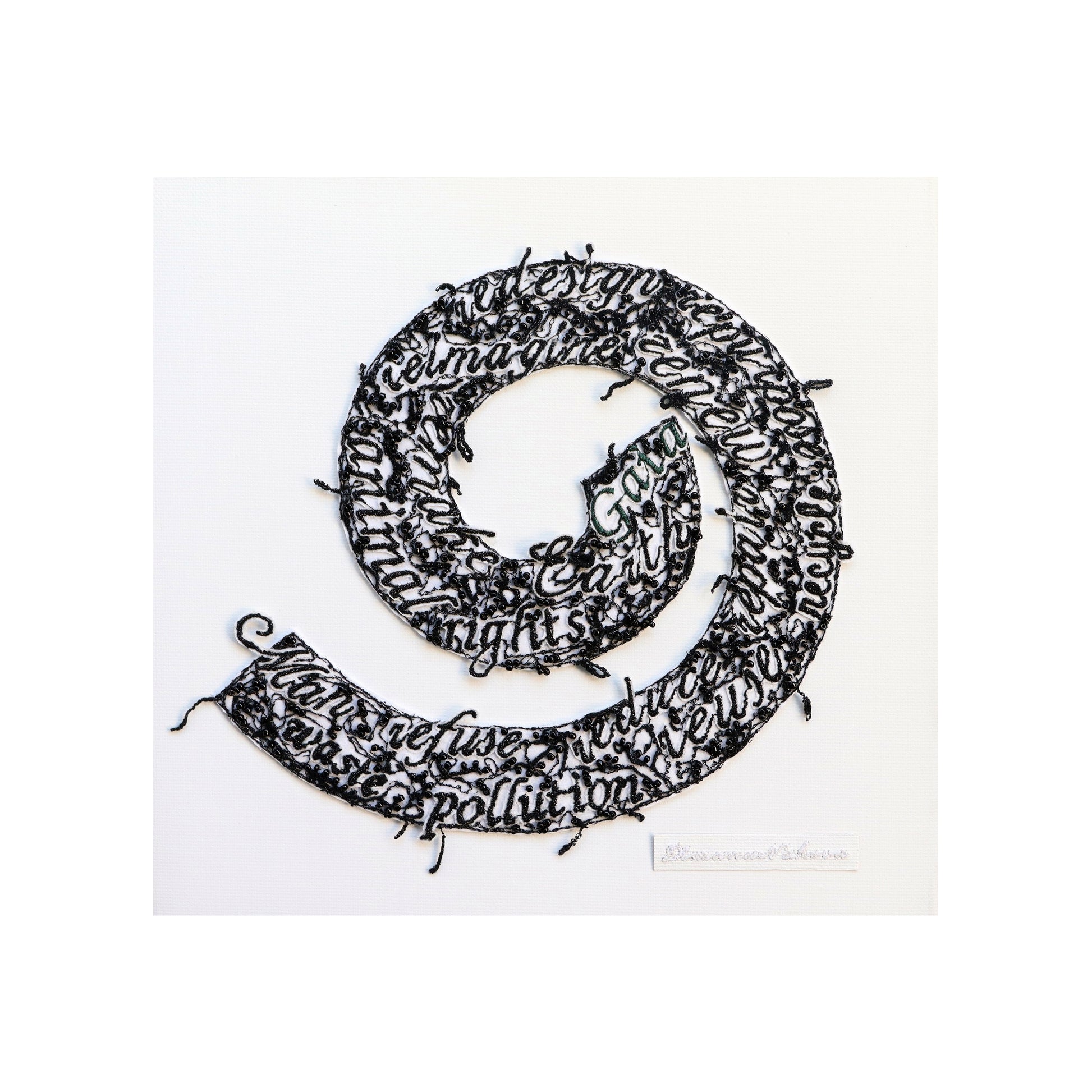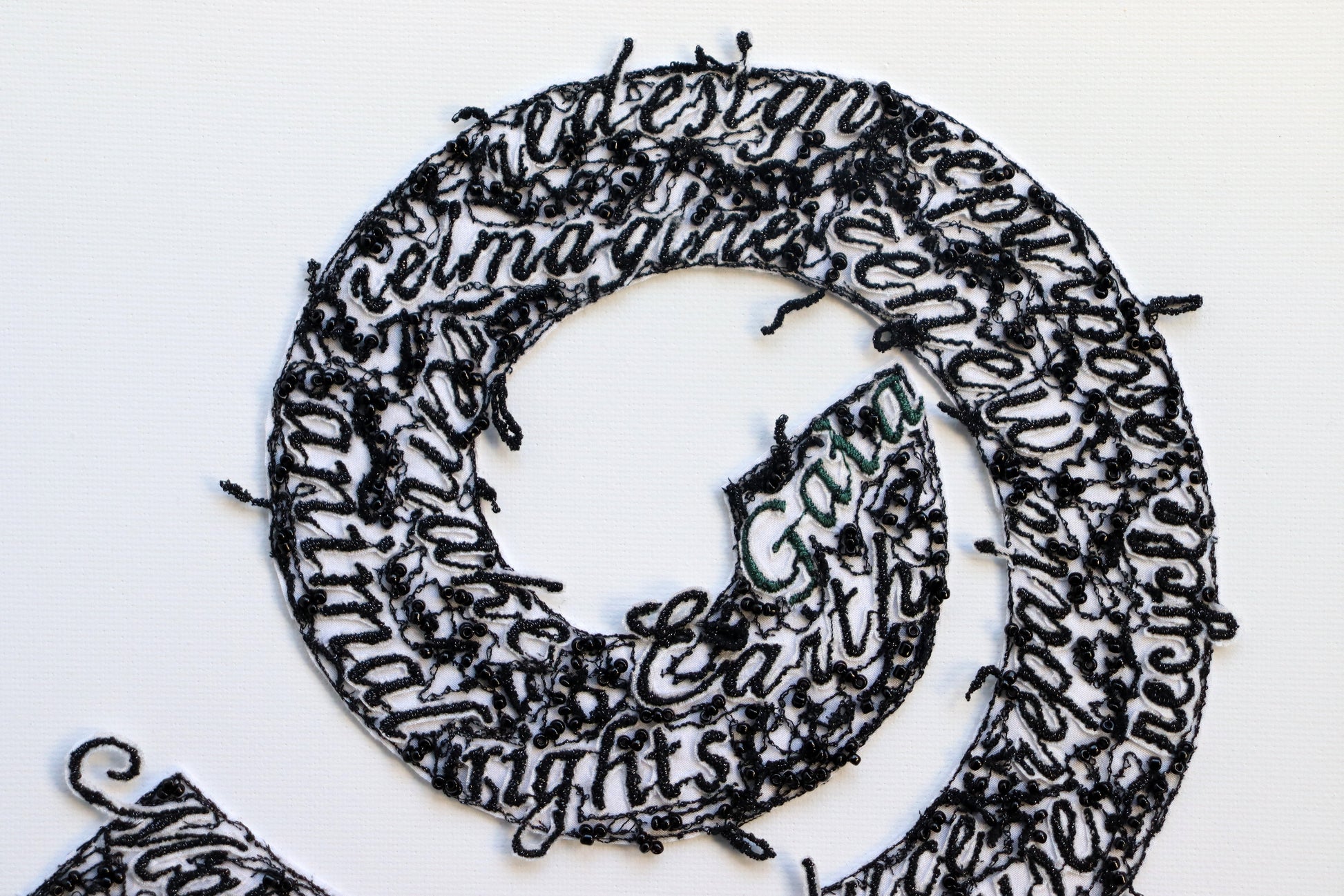 CONCEPT: Spiral, as a main symbol of Evolution, has been chosen to express Man's relationship with Nature. The Evolution of the human spirit takes place from the inside out and requires constant upgrading. The texture of the spiral visualizes the individual's moment of awareness, as well as the process of realizing this interdependence with Nature, its phases and stages that go from denial and rejection to building and perfection. This is accomplished through the use of digitally embroidered words in one work and through the use of embroidered feathers, chosen as a symbol of the animal world in the other. Feathers are also a sign of Angelic presence that helps and encourages the process of ennobling the aura of this planet. The Spiral expresses the existing dualism on this Earth, namely that while one builds and saves, the other, at the same time, still pollutes and kills. It also shows that we have not reached the phase of "0 WASTE" yet and that even the positive, ecological, already used techniques can still be improved a great deal. The Earth, or Gaia as it is called, is a living being and could only be itself when we take care not to make it sick and use it in ways that would destroy it. She is our home and we are the main factor on which her and our own survival depends!