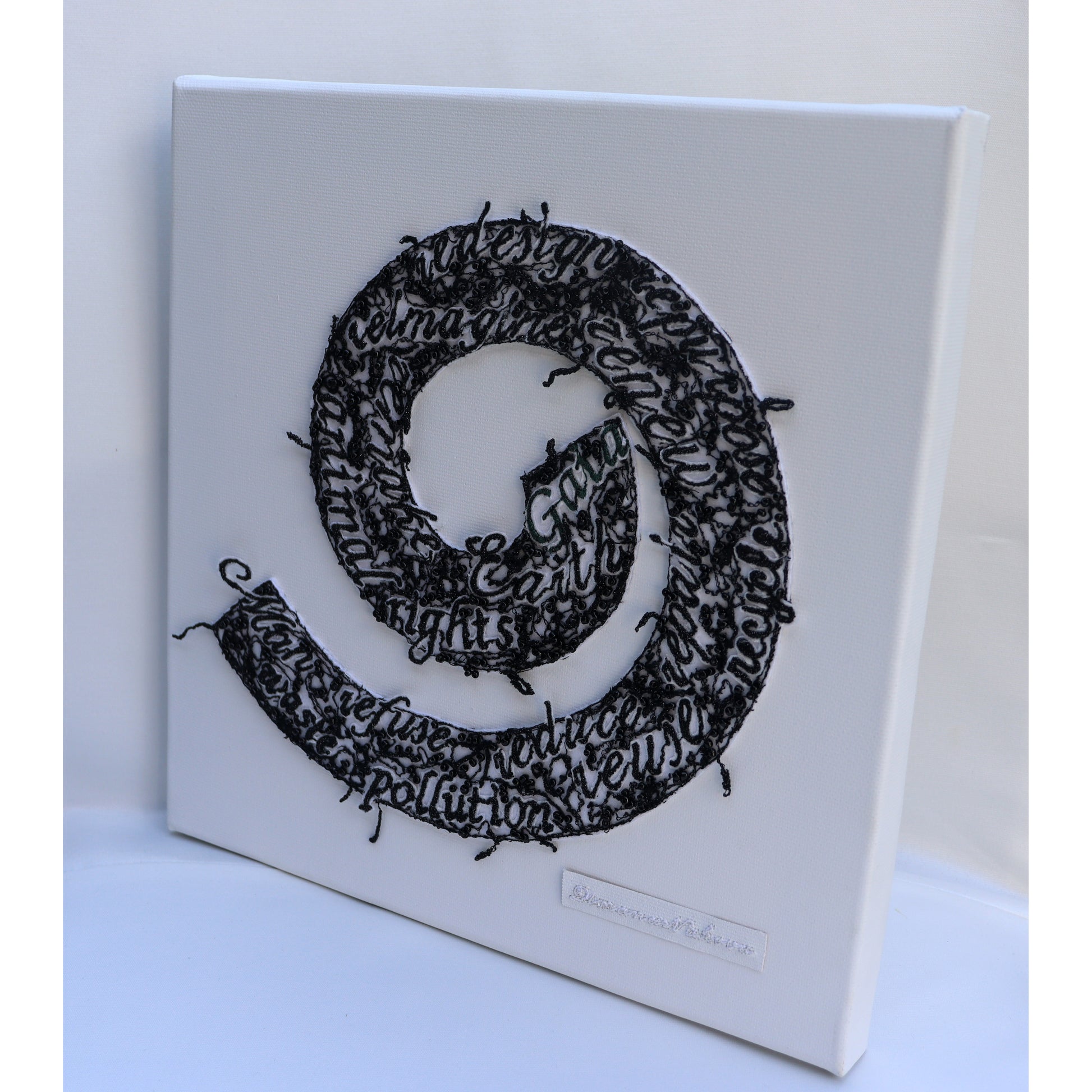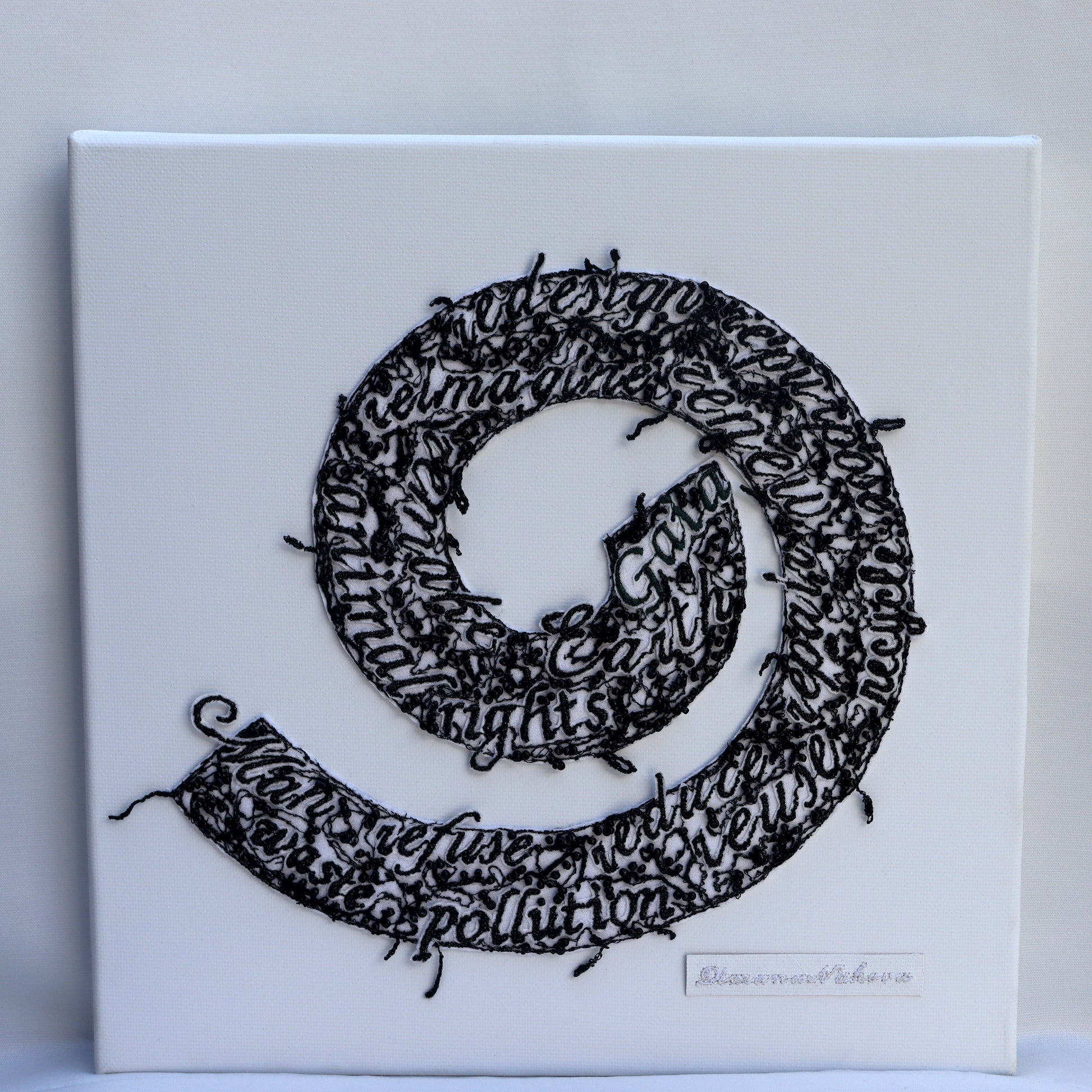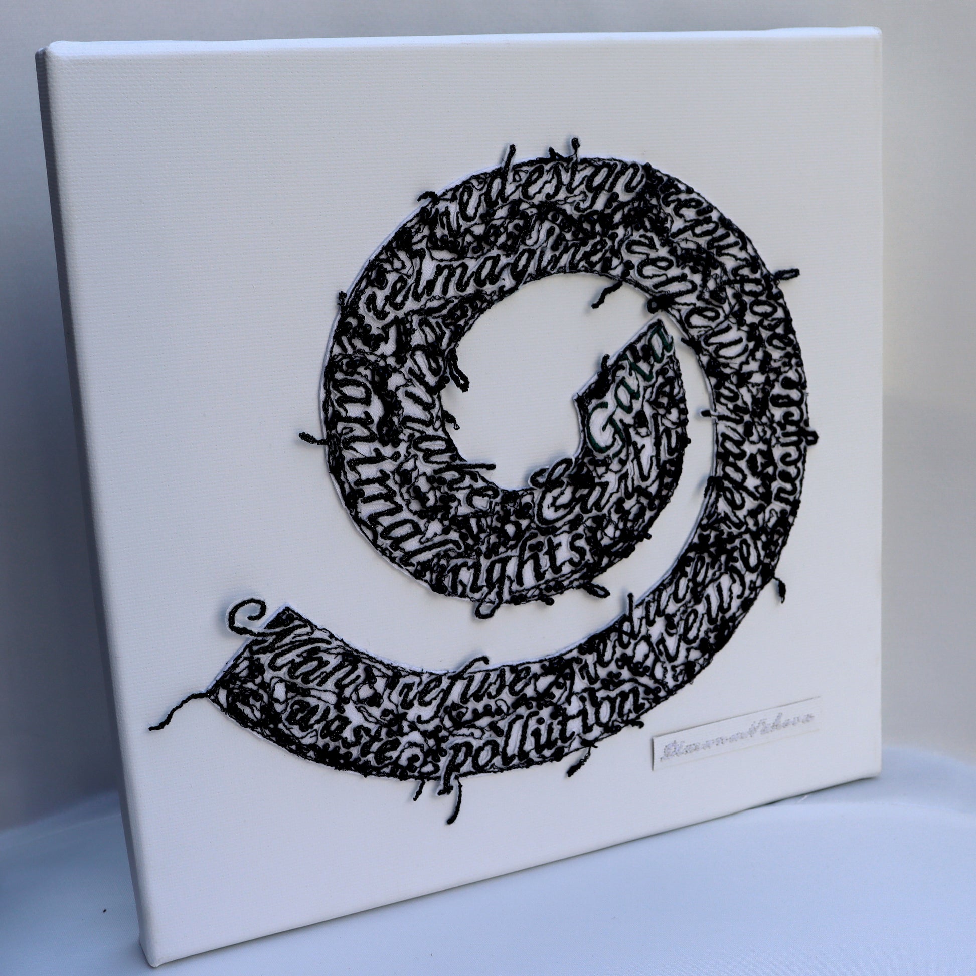 CONCEPT: Spiral, as a main symbol of Evolution, has been chosen to express Man's relationship with Nature. The Evolution of the human spirit takes place from the inside out and requires constant upgrading. The texture of the spiral visualizes the individual's moment of awareness, as well as the process of realizing this interdependence with Nature, its phases and stages that go from denial and rejection to building and perfection. This is accomplished through the use of digitally embroidered words in one work and through the use of embroidered feathers, chosen as a symbol of the animal world in the other. Feathers are also a sign of Angelic presence that helps and encourages the process of ennobling the aura of this planet. The Spiral expresses the existing dualism on this Earth, namely that while one builds and saves, the other, at the same time, still pollutes and kills. It also shows that we have not reached the phase of "0 WASTE" yet and that even the positive, ecological, already used techniques can still be improved a great deal. The Earth, or Gaia as it is called, is a living being and could only be itself when we take care not to make it sick and use it in ways that would destroy it. She is our home and we are the main factor on which her and our own survival depends!